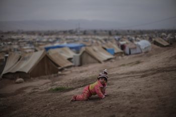 A Syrian refugee baby crawls across the ground in Domiz refugee camp in the Kurdistan Region of Iraq on 14 November, 2012.