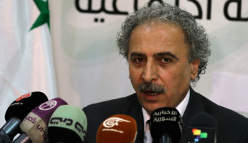 Louay Hussein, a Syrian leading intellectual and the leader of the Syrian opposition movement of “Building the Syrian State Movement” addresses a press conference in Damascus on July 12, 2012. AFP PHOTOLOUAI BESHARA (Photo credit should read LOUAI BESHARA/AFP/GettyImages)