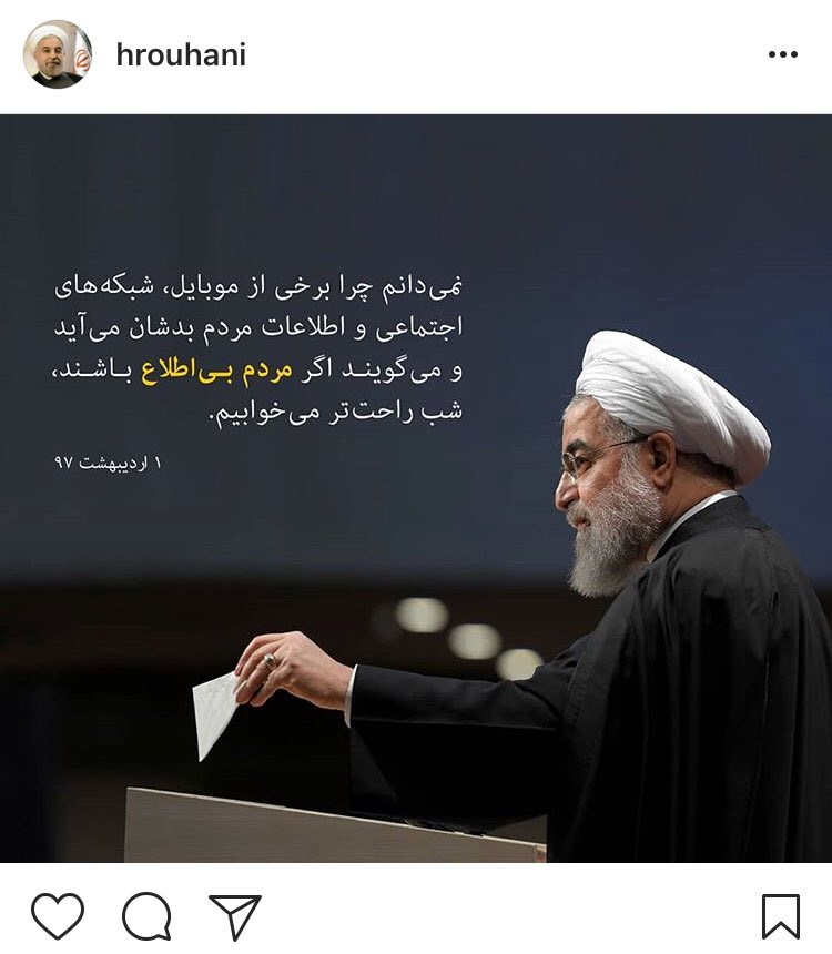 Where did Rouhani say the ban on Telegram was imposed because of instructions from the Leader’s office (daftar-e-rahbari)? Even if Khamenei gave his unofficial assent/acquiescence to the move, the decision to close Telegram was not his idea or that of anyone within his office. The intelligence services and judiciary are behind it.