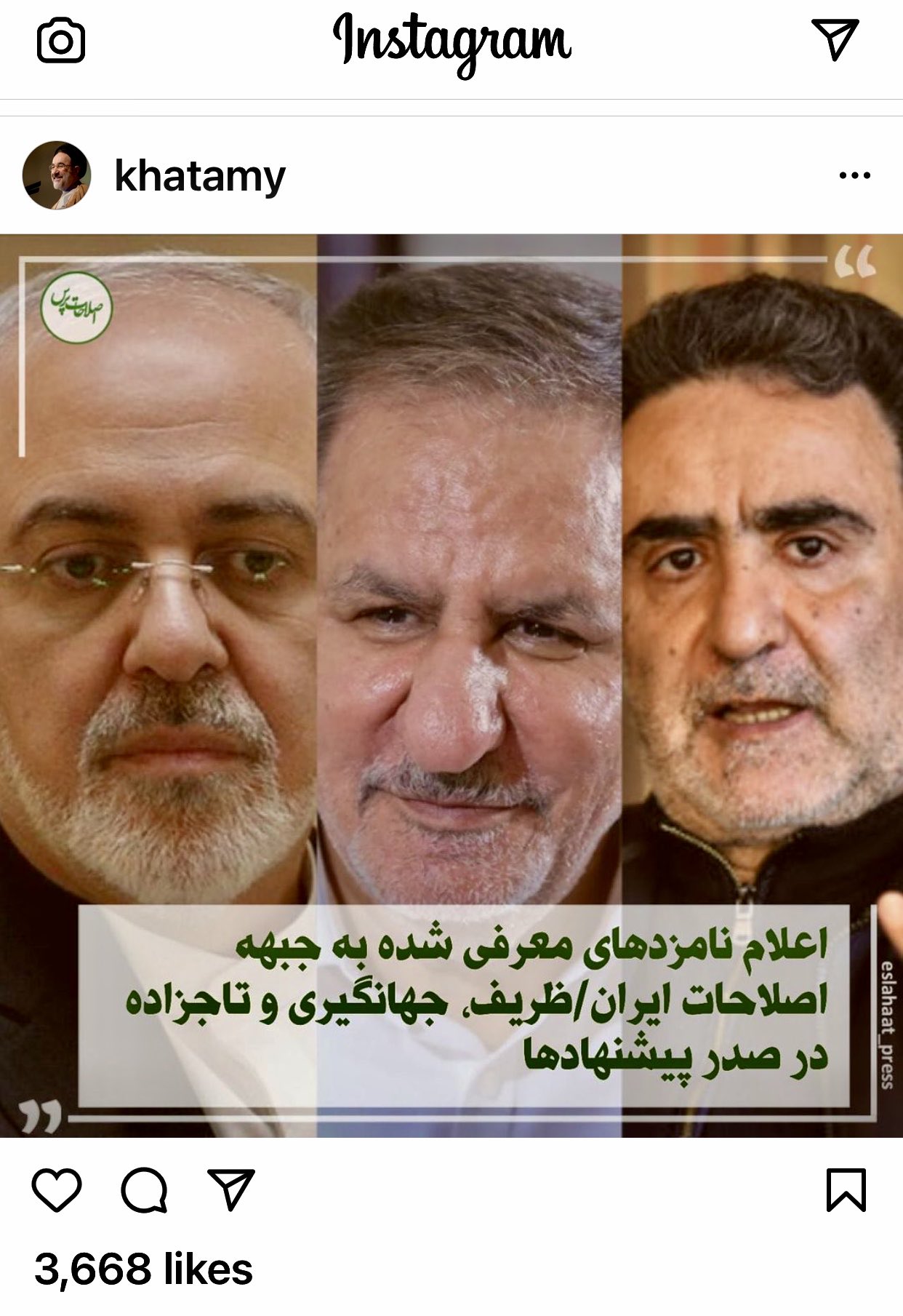 Khatami endorses 3 reformist figures for the presidential election: https://pbs.twimg.com/media/E0YPQ8nX0AASERq?format=jpg&name=large