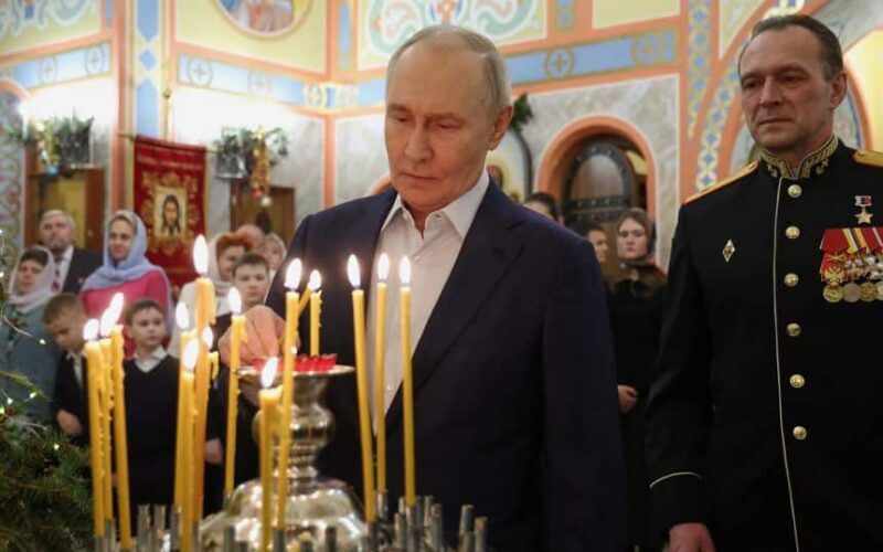 Vladimir Putin, accompanied by military personnel and their families, lights a candle at an Orthodox Christmas service, Moscow, Russia, January 7, 2026 (Vyacheslav Prokofyev/AP)
