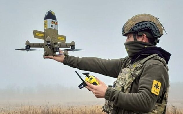 A Ukrainian soldier with an interceptor drone