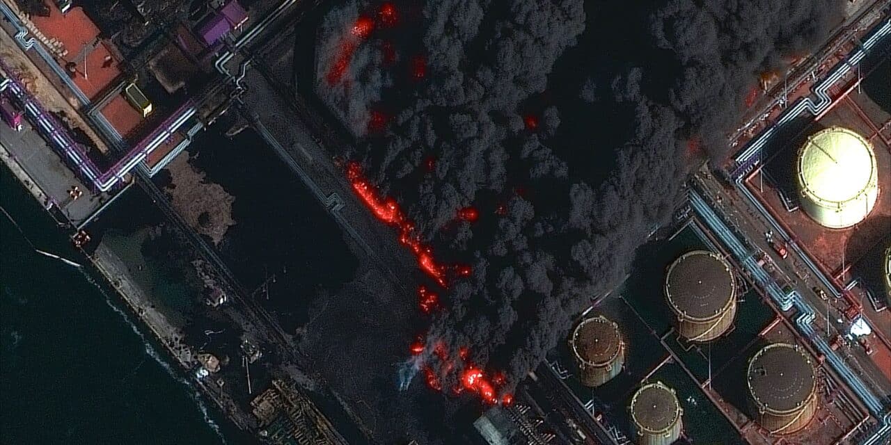 Aerial view of fires at Russia’s Ust-Luga port on the Baltic Sea after Ukrainian strikes, March 2026