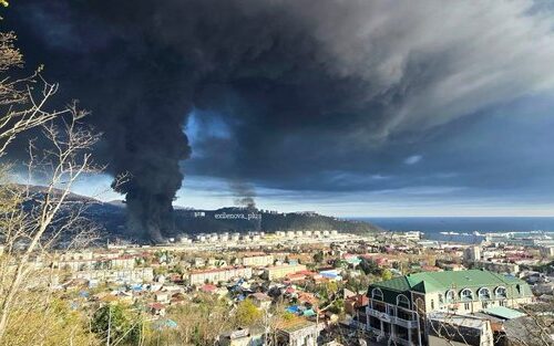 Smoke rises above the Tuapse oil refinery in southwest Russia after Ukrainian drone strikes, April 16, 2026